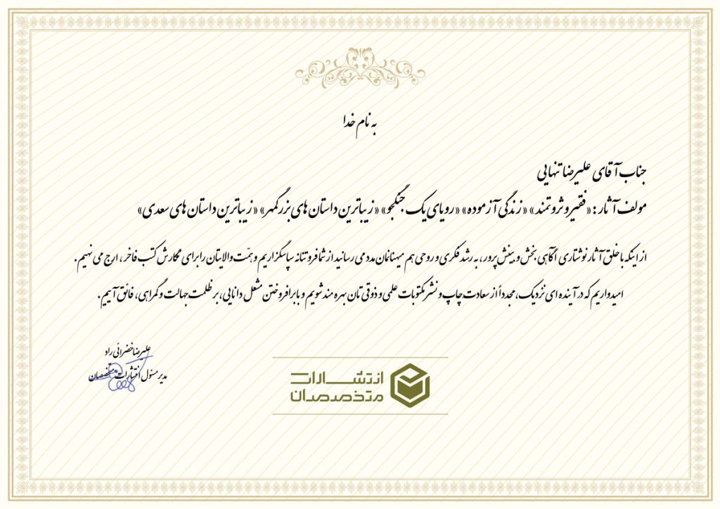 نویسنده آثار:”فقیر و ثروتمند” “رویای یک جنگجو””زندگی آزموده””زیبا ترین داستان های سعدی””زیبا ترین داستان های بزرگمهر”