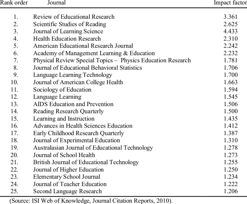 ۲۵ مجله برتر ISI Education براساس ضریب تأثیر در دهههای گذشته هم عبارتاند از: